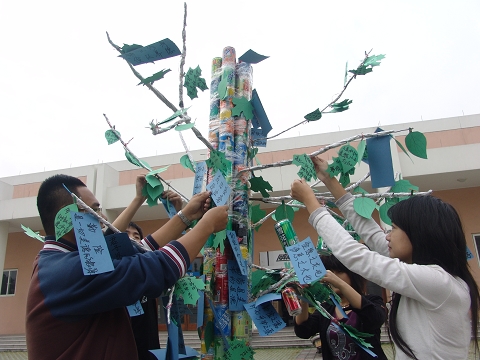 为迎接世界勤俭日的到来,10月28日中午,人文分院、建艺分院与机电分院的大学生们在学校学生食堂前“种”下了一棵用废易拉罐、废可乐瓶、废纸等材料制作而成的“环保树”,并现场向同学们宣传环保知识,征集环保节能的好点子、好建议。同学们还把这些建议写在创意书签上,并挂到“环保树”上,向更多的师生推广这些环保措施,帮助更多同学树立节约资源的意识。