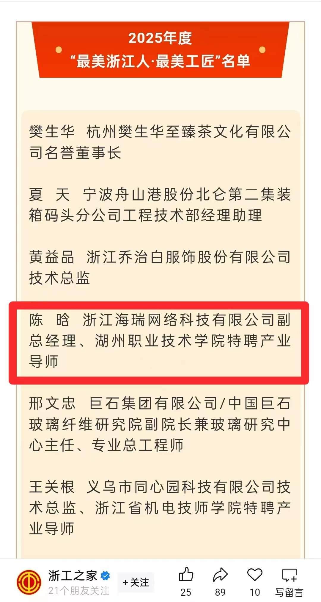 11月 25 日下午,由浙江省委宣传部、省总工会联合主办的 2025 年度 “最美浙江人・最美工匠”发布活动在杭州隆重举行。活动现场揭晓了 10 位来自全省各行各业的“最美工匠”,“浙江工匠”获得者、我校特聘产业导师、浙江海瑞网络科技有限公司副总经理陈晗凭借精湛的专业技艺与突出的行业贡献获此殊荣。